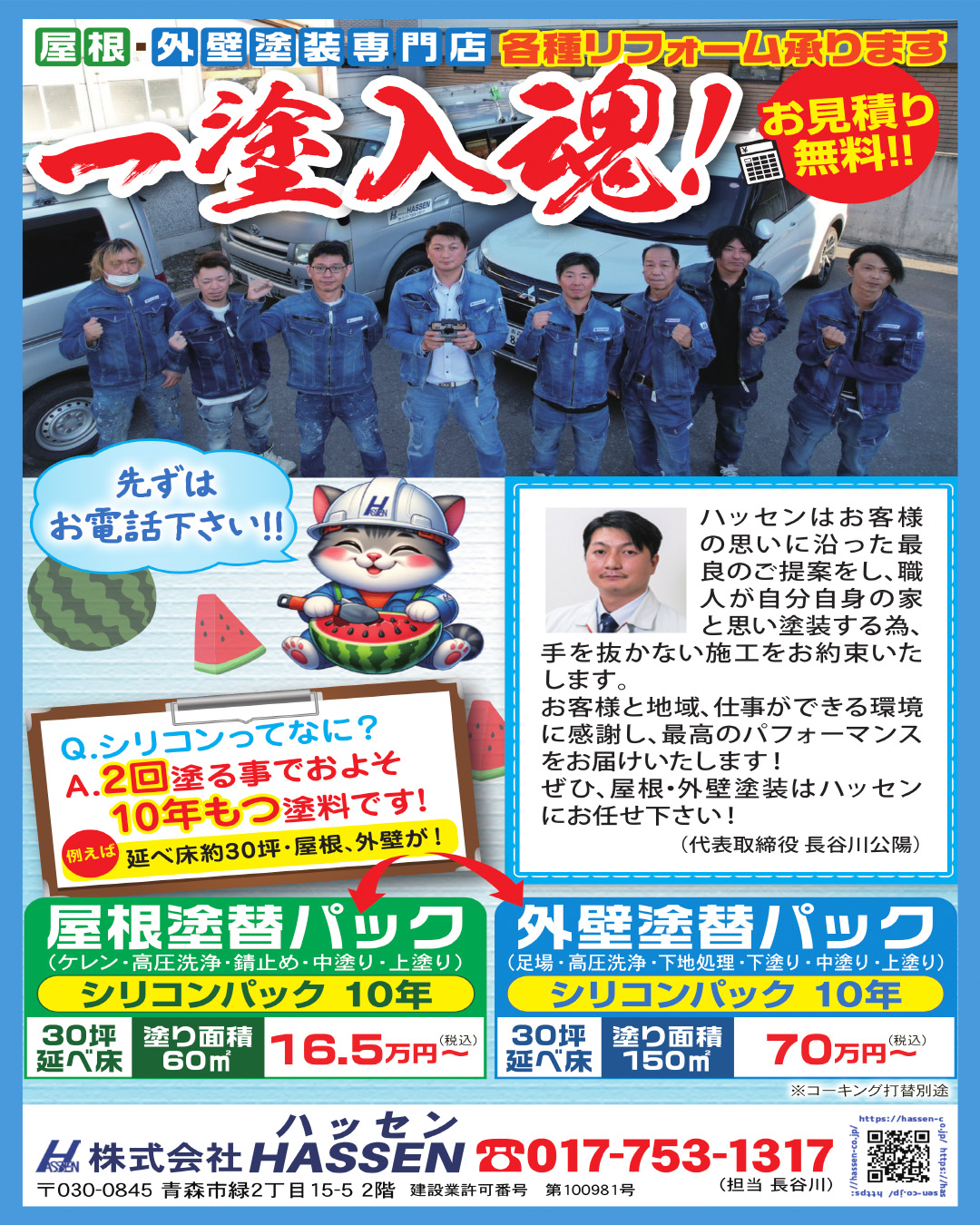 新着情報 NEWS HASSENってこんな会社です 2025.07.30 地元密着、職人直営の外壁・屋根塗装専門店です。 ✔ 自社職人が最後まで対応 ✔ 丁寧な説明・確実な施工 ✔ 安心のアフターサポートあり 「うちはまだ大丈夫かな?」という方も、まずは無料点検をご利用ください♪ TEL:017-753-1317 一塗入魂!! 一覧に戻る