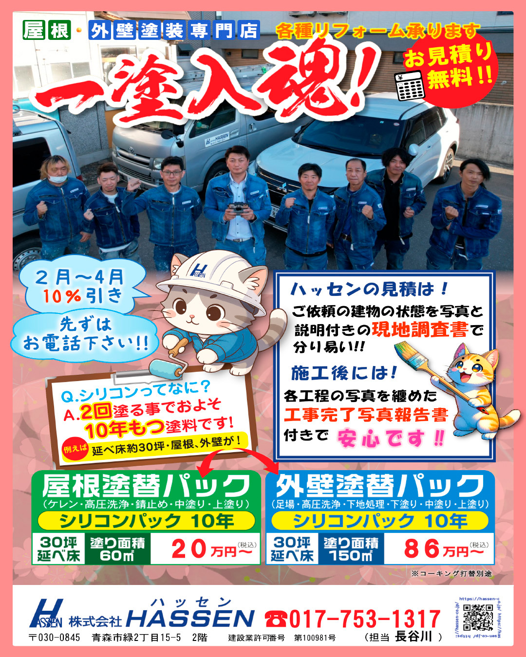 新着情報 NEWS 春は塗装におススメの季節です 2026.02.24 暖かい日が増え、春らしい陽気になってきました。 新生活が始まるこの季節は、住まいのメンテナンスを考える方も増える時期です。 実は春は、外壁塗装・屋根塗装にとても適したシーズンです。 春が塗装に向いている理由 ・気温が安定している ・湿度が比較的安定している ・塗料が乾きやすく、仕上がりが安定しやすい これらの条件が揃うことで、施工の品質も安定しやすくなります。 また、冬の間に受けたダメージが表面化しやすいのもこの時期です。 外壁のひび割れや色あせ、屋根の劣化など、気になる症状があれば早めの点検をおすすめします。 春のうちにメンテナンスを 塗装は「見た目をきれいにする」だけでなく、 紫外線や雨風からお住まいを守る大切な役割があります。 本格的な梅雨や夏の強い日差しを迎える前に、 春のうちにしっかりメンテナンスをしておくと安心です。 「まだ大丈夫かな?」と思っている方も、 まずは点検からお気軽にご相談ください。 大切なお住まいを、長く守るお手伝いをさせていただきます✨ 一塗入魂!! TEL:017-753-1317 一覧に戻る
