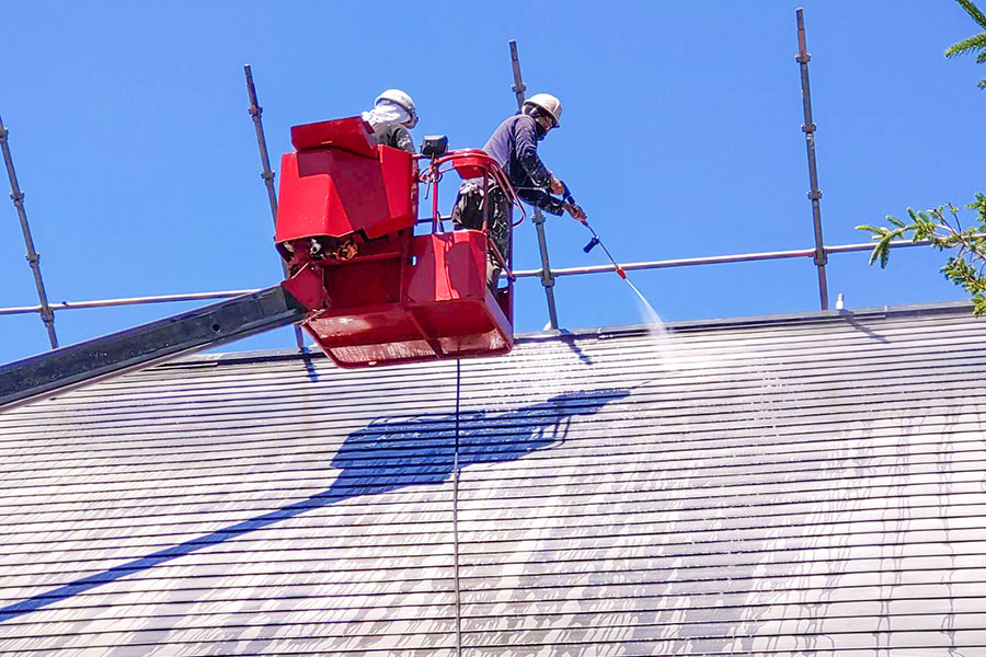今回の物件は屋根が急勾配なため、屋根足場をかけての作業です。高所作業車を用いることで、不必要に足場代がかからないようコストを抑えるご提案をし、施工いたしました。