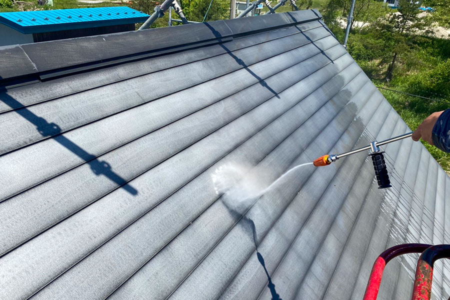 塗料をトタンに密着させるためにケレン作業、高圧洗浄を行い、錆び止めを塗り、仕上げを2回塗りし無事完了となりました。